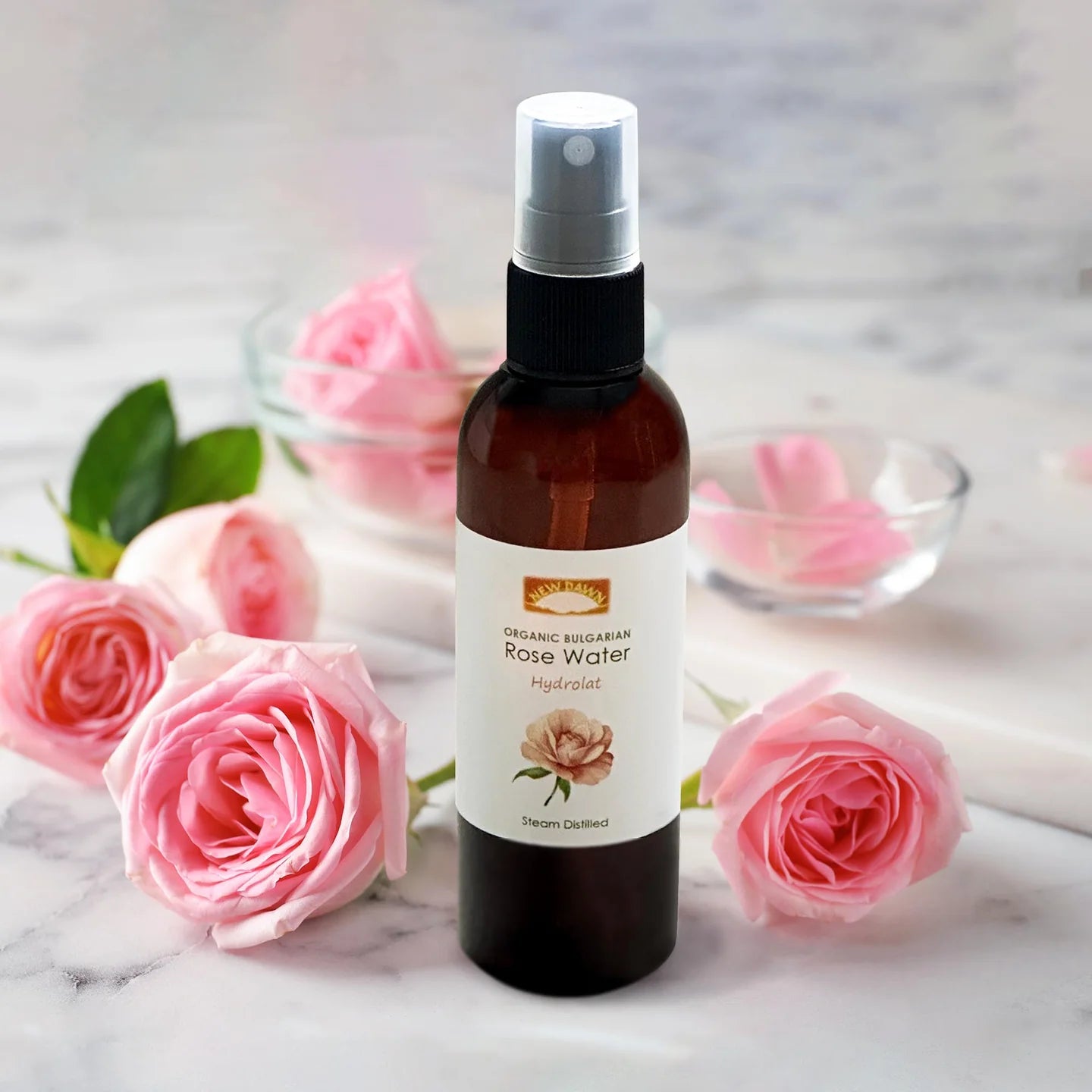 Our Organic Bulgarian Rose Water Spray is made from thousands of Damask rose petals, steam-distilled for the highest purity and quality.